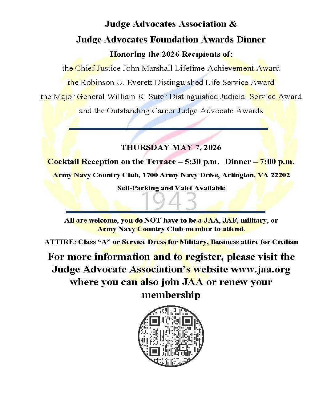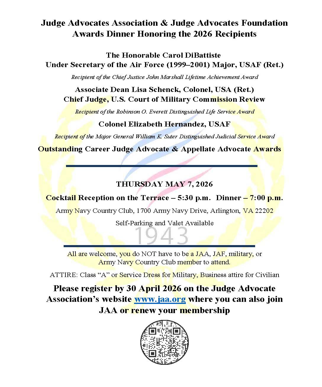 The Judge Advocates Association is a national legal society that was organized in 1943 by a small group of Army attorneys in Washington, D.C. Our membership now includes active duty, reserve, and guard judge advocates and paralegals, law school students, and retired judge advocates from all of the armed services.