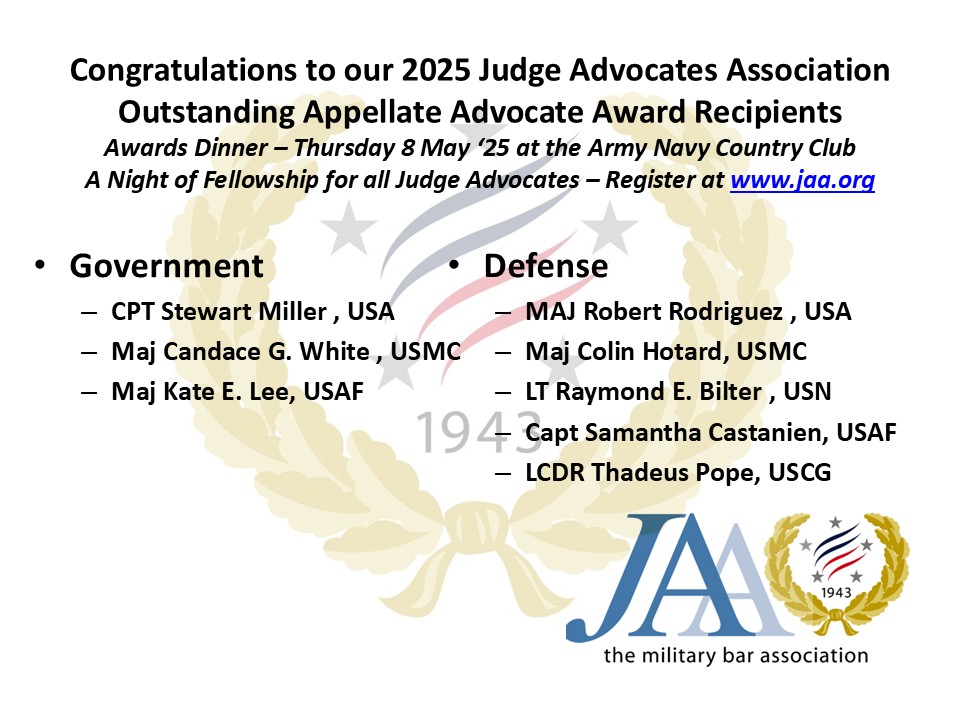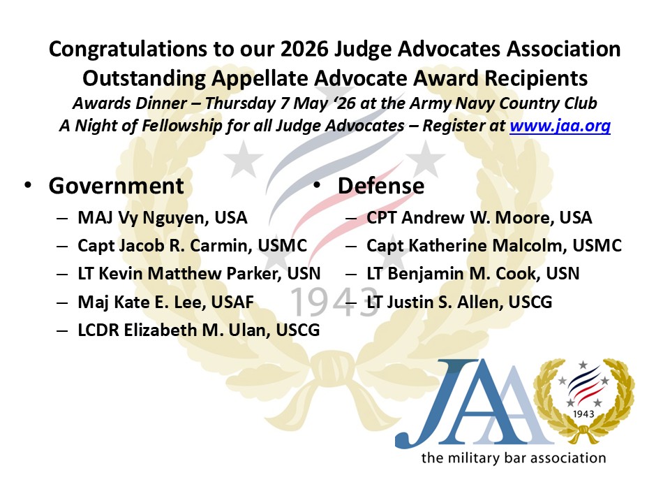In coordination with the Court of Appeals for the Armed Forces, the Judge Advocates Association recognizes judge advocates from each service for the JAA Outstanding Appellate Government and Appellate Defense Advocacy Awards. Awardees are honored at the Court of Appeals for the Armed Forces annual conference and invited to the Judge Advocates Association and Judge Advocates Foundation Awards Dinner at the Army and Navy Country Club in Arlington, Virginia.